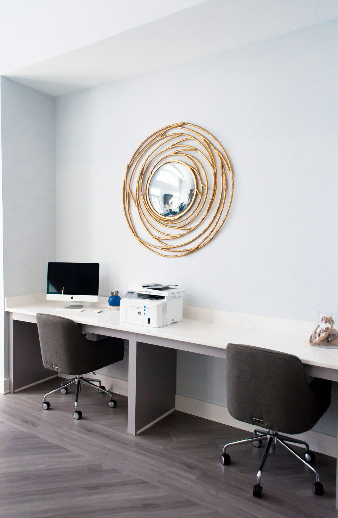 We start in the main lounge area. The area has a mounted tv, fireplace, and various seating. There is a shuffleboard table, small business center with computer and printer, club kitchen, and access to the pool area. To the left of the kitchen area is the leasing center with offices and reception desk where the main entry is located. To the right from the business center is access to the fitness area. A short hall connects with 2 bathroom and water fountains. This leads to the fitness center with various workout equipment and a tv. Zoom Image